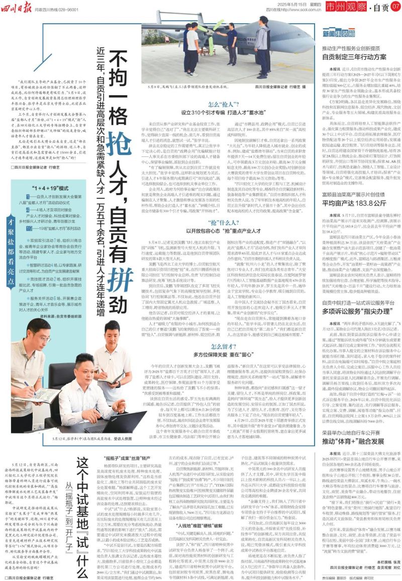 近日,自贡创新发展投资集团总经理助理、自贡市产业转型升级研究院副院长张学丰接受四川日报采访,相关内容于2025年5月15日在四川日报07版《不拘一格抢人才,自贡有拼劲》刊发。采访中,张学丰副总分享了依托自贡“政聘企用”创新机制,从北京科研机构投身我市产业基金投资的历程,展现了自贡以制度赋能激活人才动能、以基金投资撬动产业升级的创新实践。